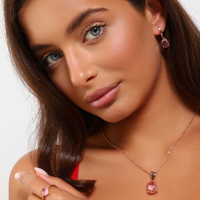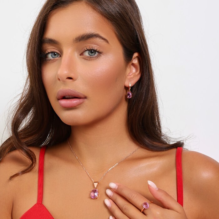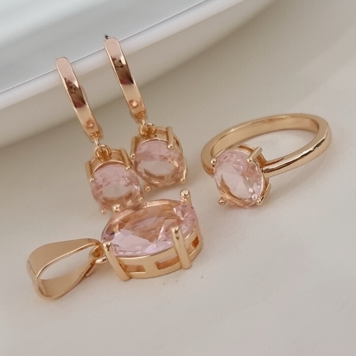 Комплект ювелирной бижутерии коллекция "Дубай" серьги, кулон и кольцо 18 р, покрытие позолота, вставка: фианит, цвет: розовый, арт.215.505-18 2 фото