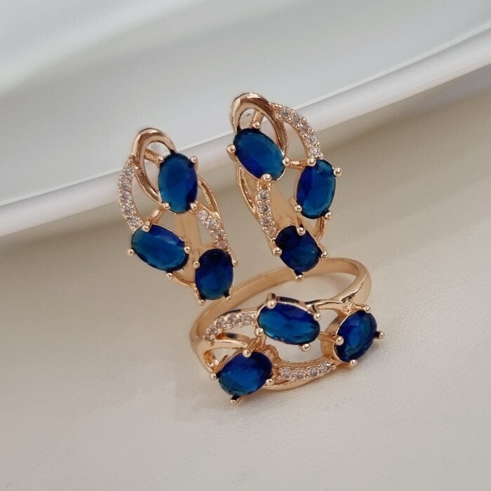 Комплект ювелирной бижутерии коллекция "Дубай" серьги и кольцо 17 р, покрытие позолота, вставка: фианиты, цвет: синий, арт.215.515-17 2 фото