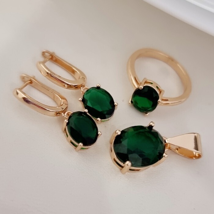 Комплект ювелирной бижутерии коллекция "Дубай" серьги, кулон и кольцо 18 р, покрытие позолота, вставка: фианит, цвет: зеленый, арт.215.504-18 2 фото