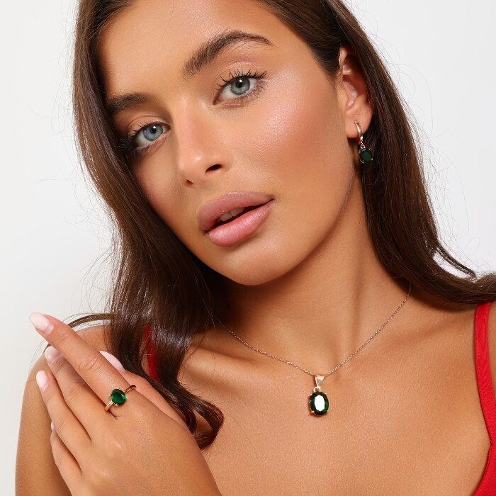 Комплект ювелирной бижутерии коллекция "Дубай" серьги, кулон и кольцо 17 р, покрытие позолота, вставка: фианит, цвет: зеленый, арт.215.504-17 2 фото