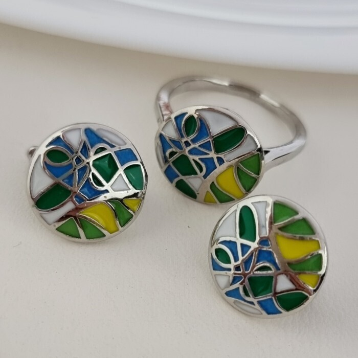 Комплект ювелирной бижутерии серьги и кольцо 20 р, покрытие позолота, вставка: цветная эмаль, цвет:желтый, зеленый и белый, арт.313.213-20 2 фото