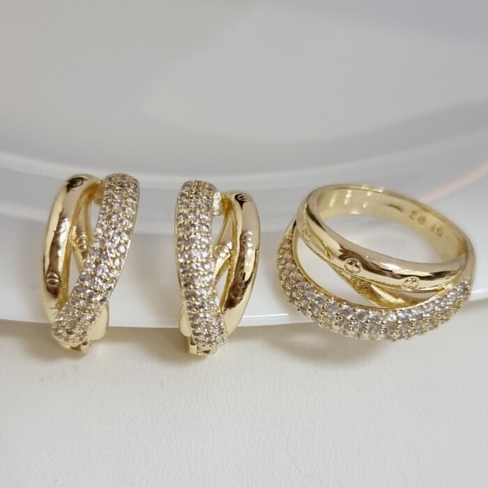 Комплект ювелирной бижутерии Итальянское золото (покрытие желтое 14к), серьги и кольцо 18 р, вставка: фианиты, цвет: прозрачный, арт.313.218-18 2 фото