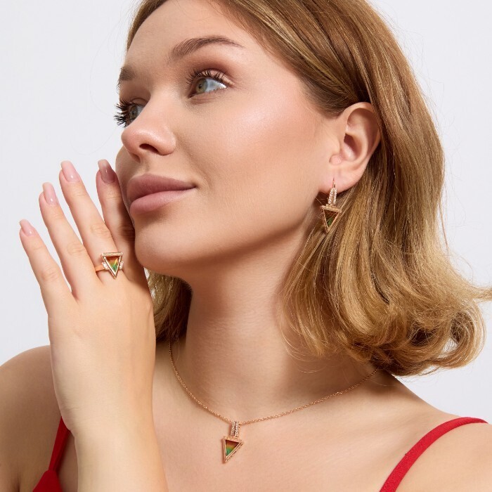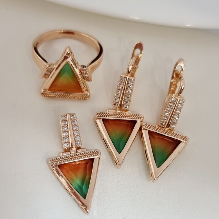 Комплект ювелирной бижутерии коллекция "Дубай" серьги, кулон и кольцо 18 р, покрытие позолота, вставка: фианиты, цвет: зеленый и оранжевый, арт.313.181-18 2 фото