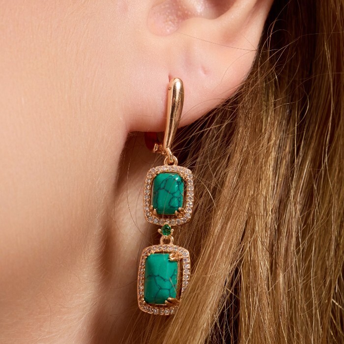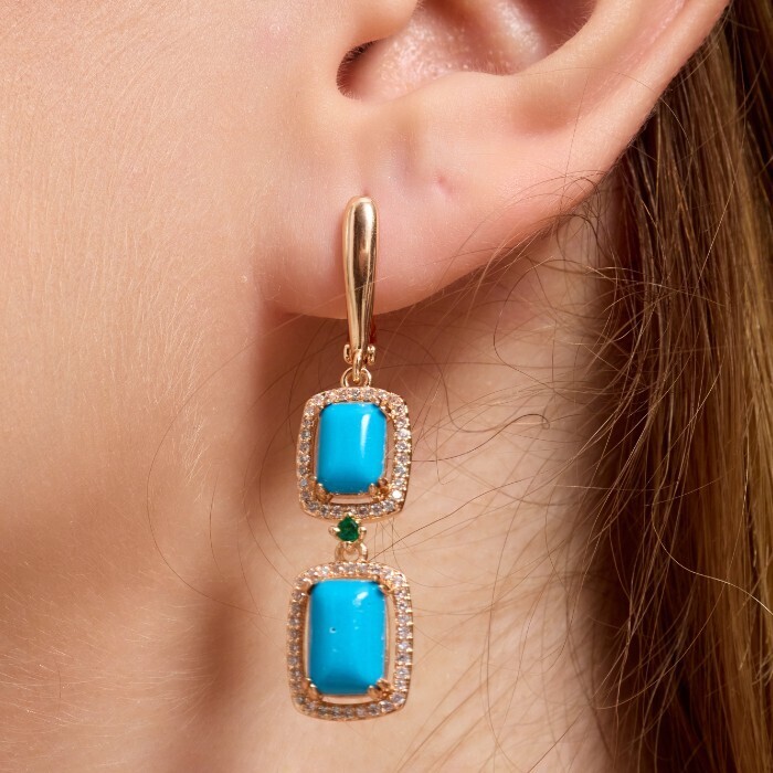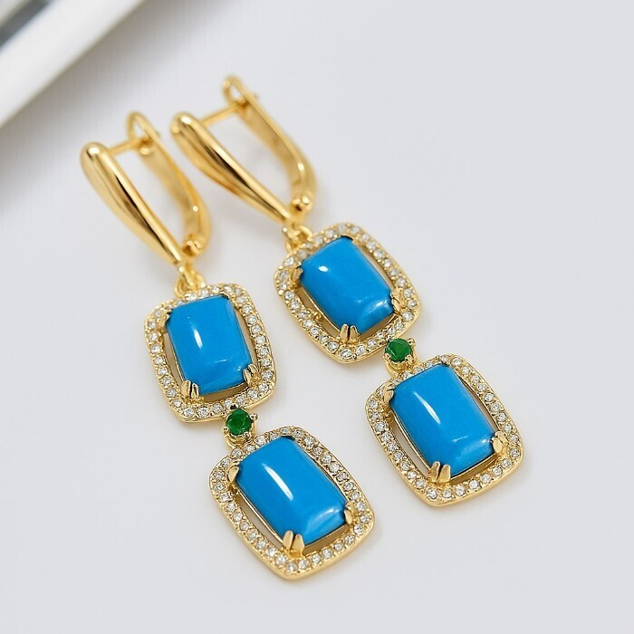 Серьги длинные ювелирная бижутерия коллекция "Дубай", покрытие позолота, вставка: пластик и цирконы, цвет: бирюзовый и прозрачный, арт.313.395 2 фото