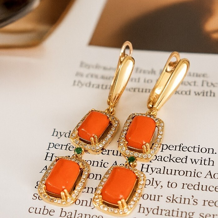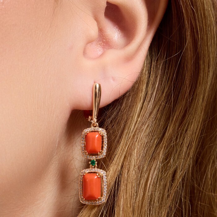 Серьги длинные ювелирная бижутерия коллекция "Дубай", покрытие позолота, вставка: пластик и цирконы, цвет: оранжевый и прозрачный, арт.313.393 2 фото