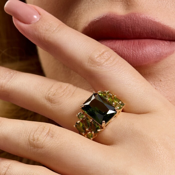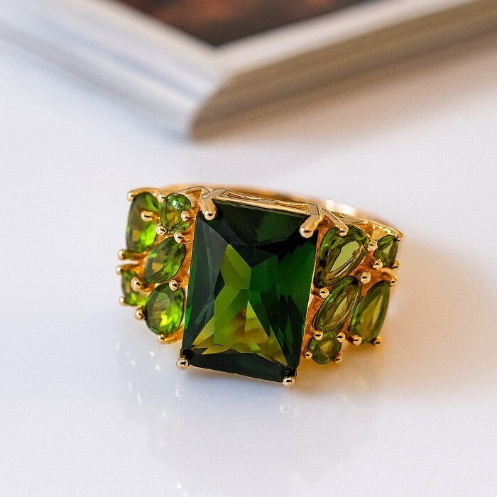 Кольцо 17 р ювелирная бижутерия коллекция "Дубай", покрытие позолота, вставка: фианиты, цвет: оливковый, арт.313.357-17 2 фото