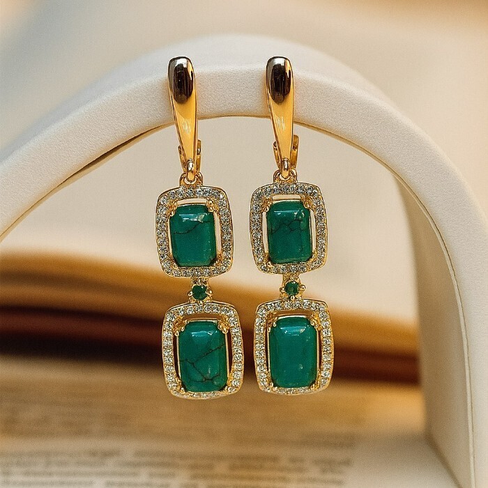 Серьги длинные ювелирная бижутерия коллекция "Дубай", покрытие позолота, вставка: пластик и цирконы, цвет: зеленый и прозрачный, арт.313.394 2 фото