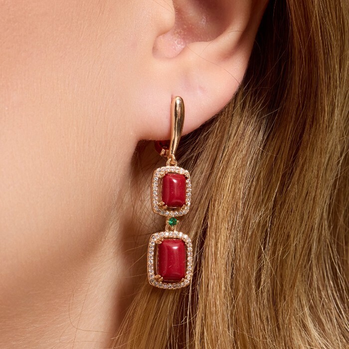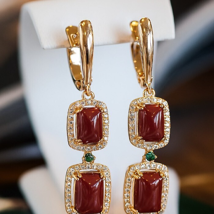 Серьги длинные ювелирная бижутерия коллекция "Дубай", покрытие позолота, вставка: пластик и цирконы, цвет: бордовый и прозрачный, арт.313.391 2 фото