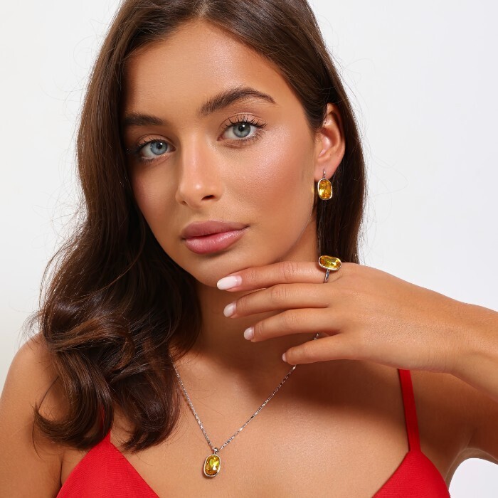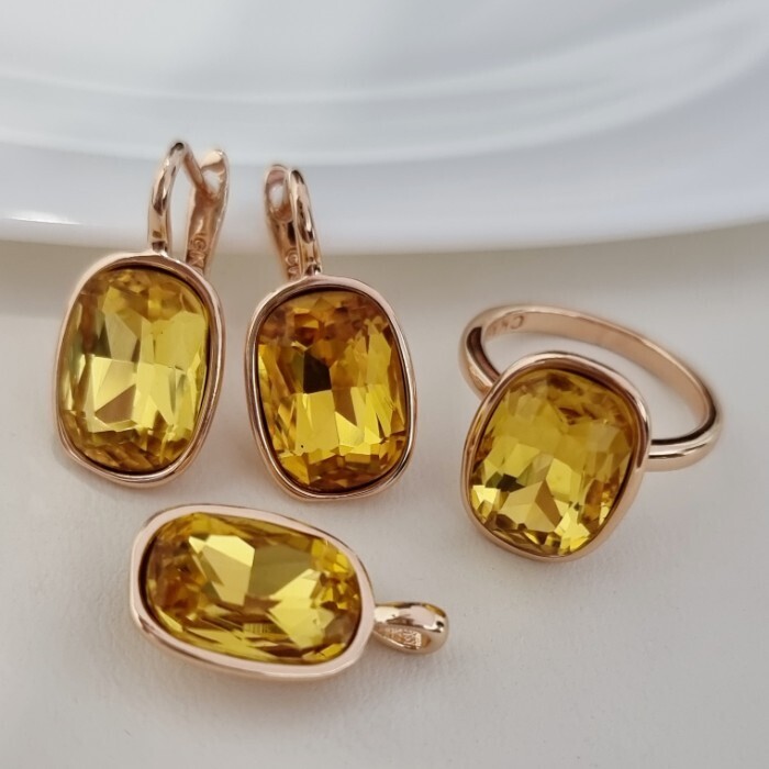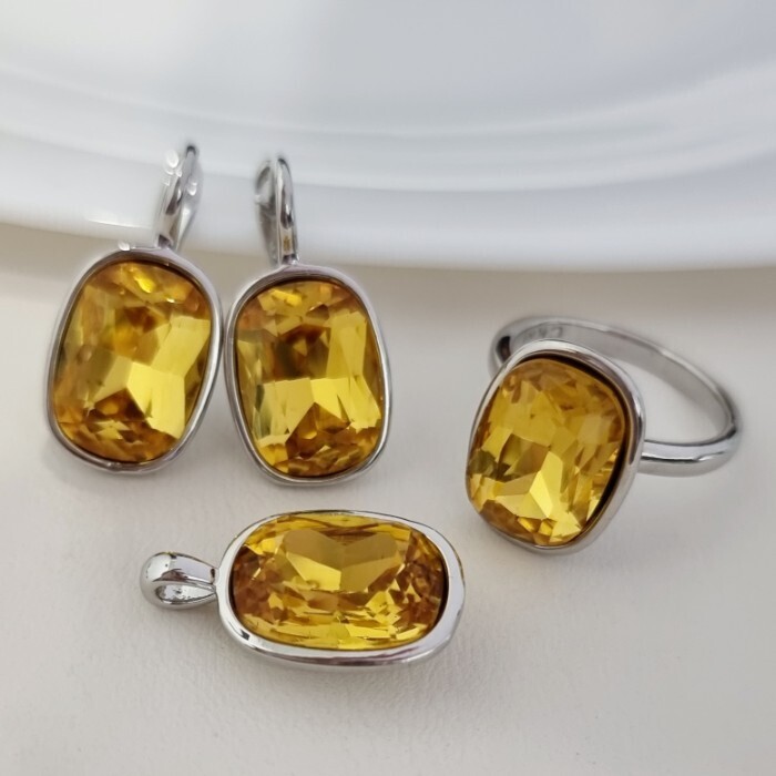 Комплект ювелирной бижутерии серьги, кулон и кольцо 19 р, покрытие посеребрение, вставка: искусственный кристалл, цвет: желтый, арт.314.867-19 2 фото