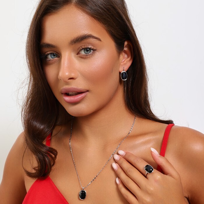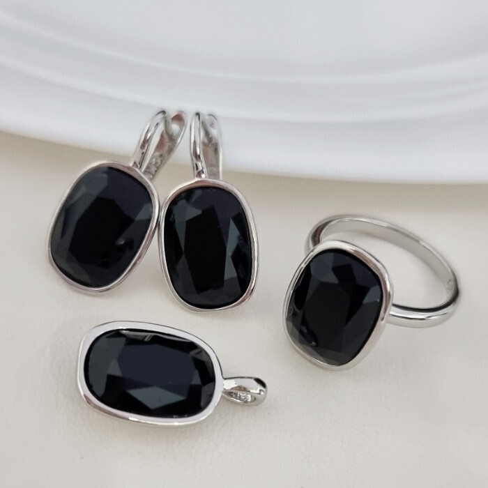 Комплект ювелирной бижутерии серьги, кулон и кольцо 18 р, покрытие посеребрение, вставка: искусственный кристалл, цвет: черный, арт.314.866-18 2 фото