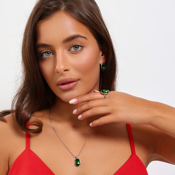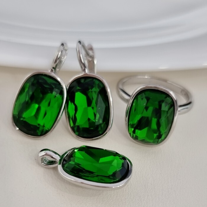 Комплект ювелирной бижутерии серьги, кулон и кольцо 17 р, покрытие посеребрение, вставка: искусственный кристалл, цвет: изумрудный, арт.314.864-17 2 фото