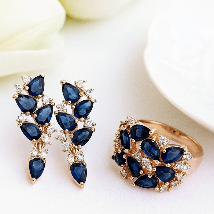 Комплект украшений ювелирная бижутерия Дубайское золото серьги и кольцо 17 р, покрытие позолота, вставка: фианит, цвет: синий, арт.215.233-17,5 2 фото