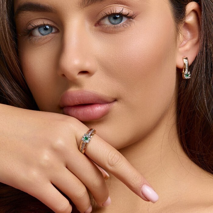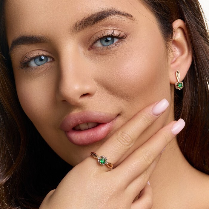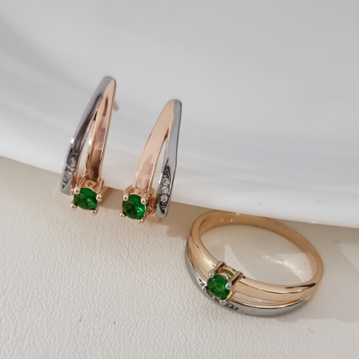 Комплект ювелирной бижутерии коллекция "Дубай" серьги и кольцо 17 р, покрытие позолота, вставка: фианиты и цирконы, цвет: зеленый и прозрачный, арт.215.676-17 2 фото