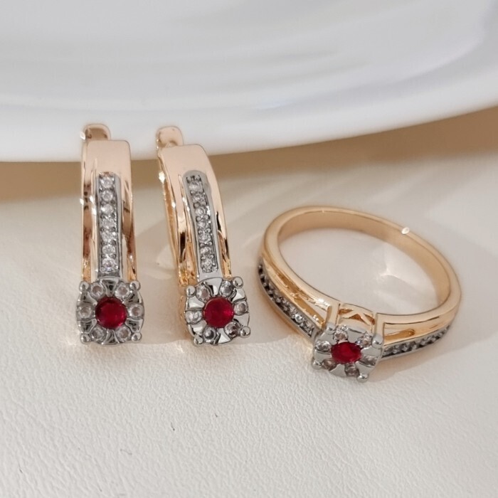Комплект ювелирной бижутерии коллекция "Дубай" серьги и кольцо 18 р, покрытие позолота, вставка: фианиты и цирконы, цвет: красный и прозрачный, арт.215.690-18 2 фото