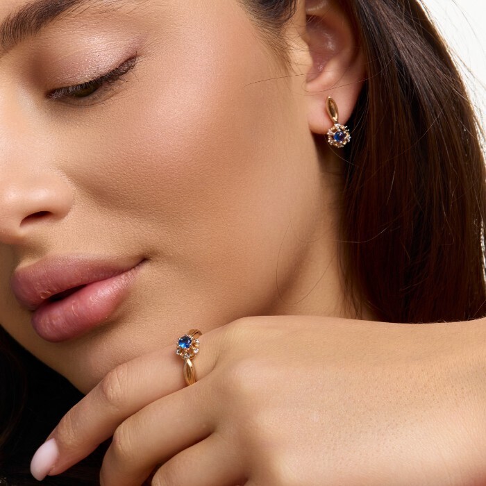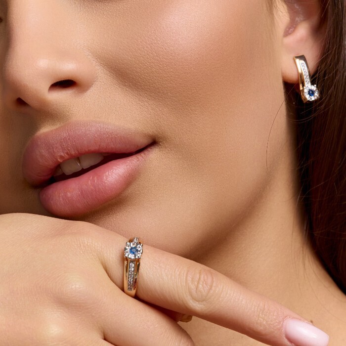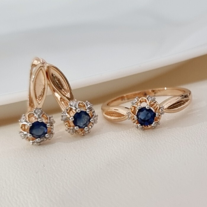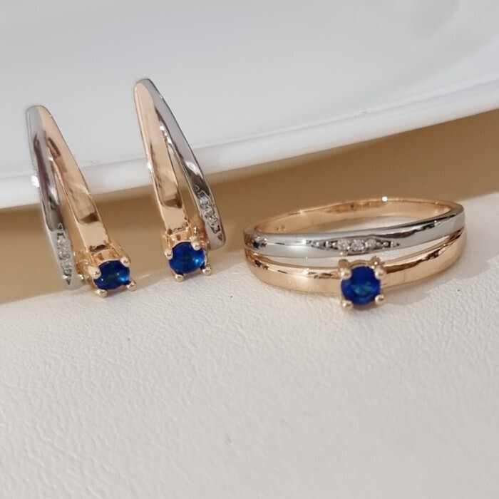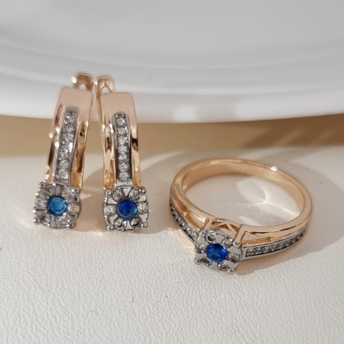 Комплект ювелирной бижутерии коллекция "Дубай" серьги и кольцо 20 р, покрытие позолота, вставка: фианиты и цирконы, цвет: синий и прозрачный, арт.215.677-20 2 фото