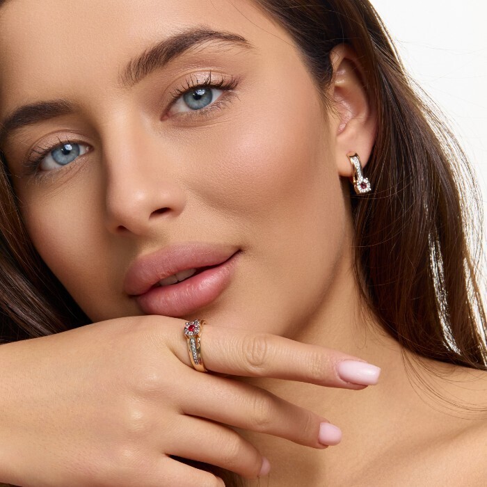 Комплект ювелирной бижутерии коллекция "Дубай" серьги и кольцо 19 р, покрытие позолота, вставка: фианиты и цирконы, цвет: красный и прозрачный, арт.215.690-19 2 фото