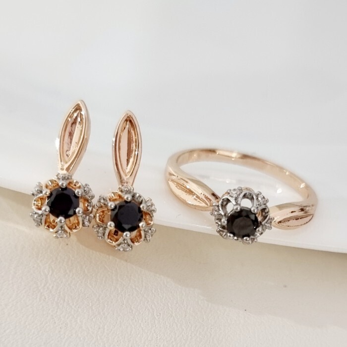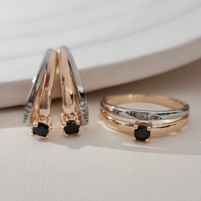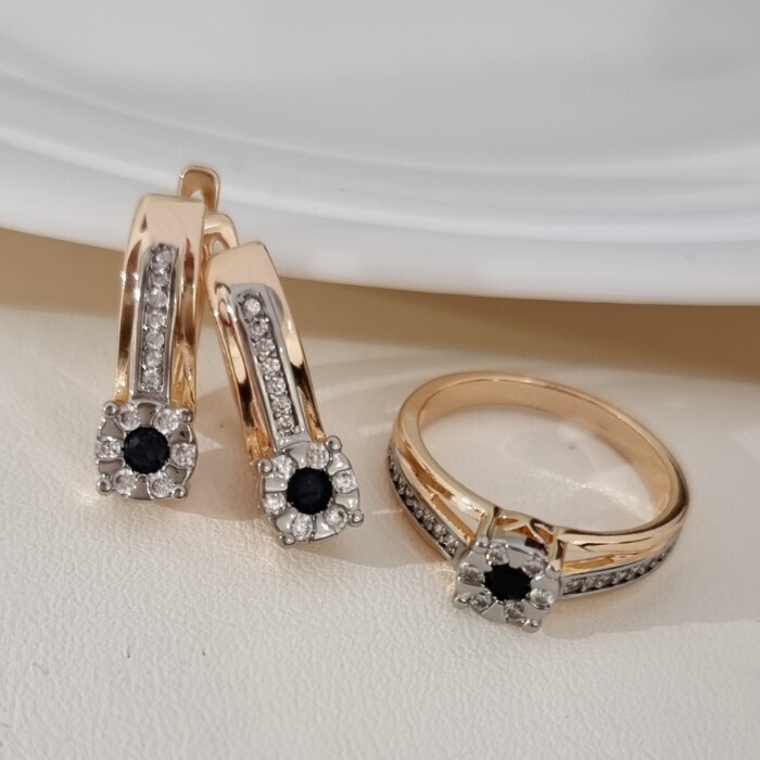 Комплект ювелирной бижутерии коллекция "Дубай" серьги и кольцо 19 р, покрытие позолота, вставка: фианиты и цирконы, цвет: черный и прозрачный, арт.215.695-19 2 фото