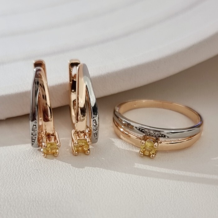 Комплект ювелирной бижутерии коллекция "Дубай" серьги и кольцо 19 р, покрытие позолота, вставка: фианиты и цирконы, цвет: желтый и прозрачный, арт.215.688-19 2 фото