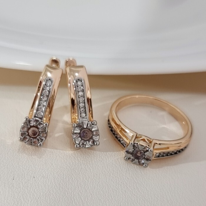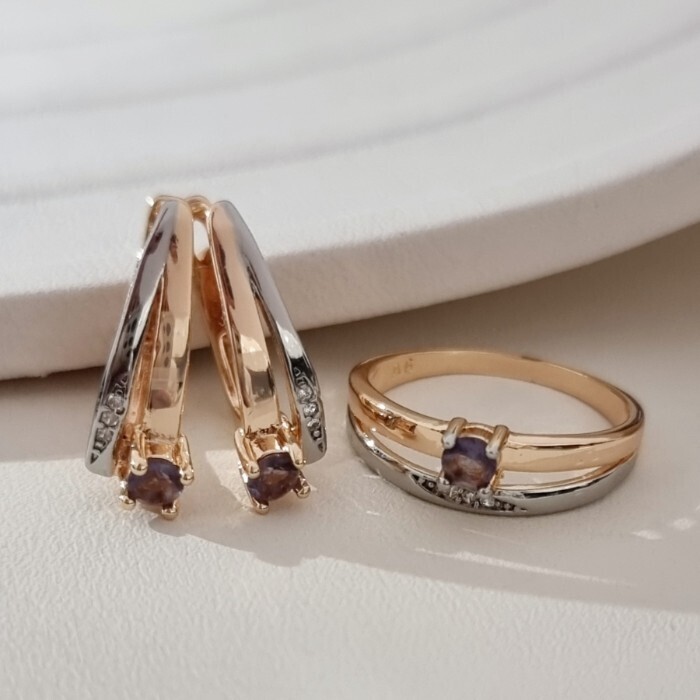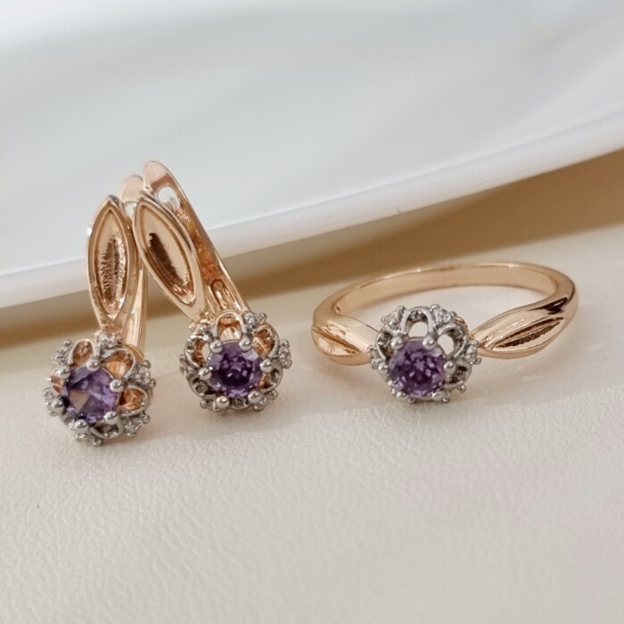 Комплект ювелирной бижутерии коллекция "Дубай" серьги и кольцо 17 р, покрытие позолота, вставка: фианиты и цирконы, цвет: фиолетовый и прозрачный, арт.215.673-17 2 фото