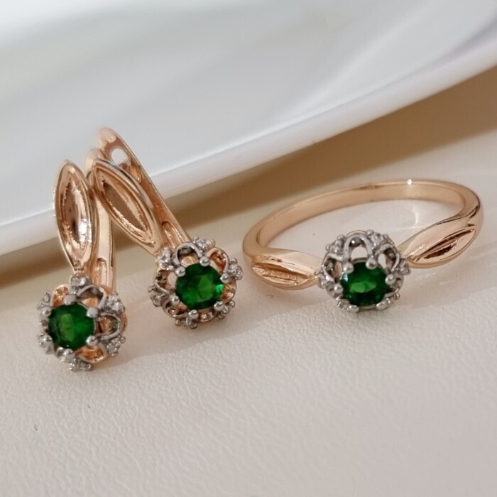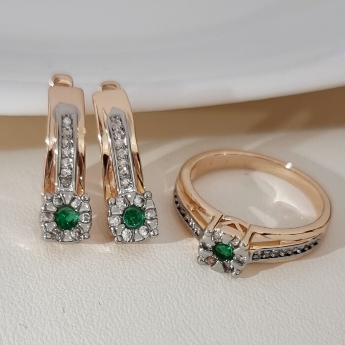 Комплект ювелирной бижутерии коллекция "Дубай" серьги и кольцо 20 р, покрытие позолота, вставка: фианиты и цирконы, цвет: зеленый и прозрачный, арт.215.676-20 2 фото