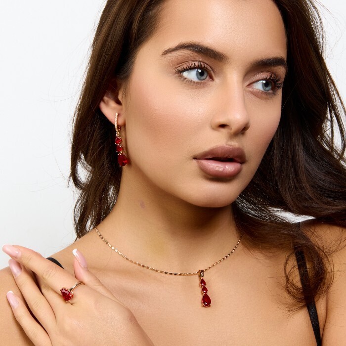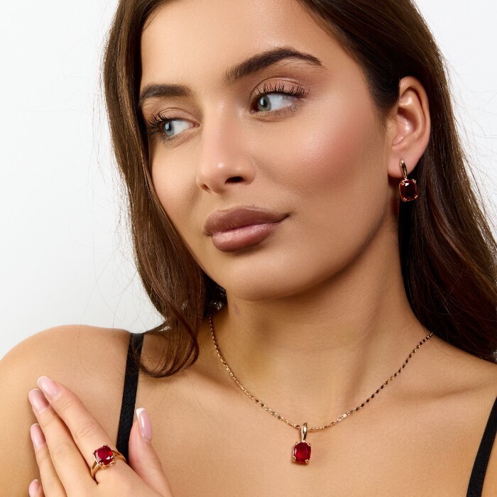 Комплект ювелирной бижутерии коллекция "Дубай" серьги, кулон и кольцо 17 р, покрытие позолота, вставка: фианиты и цирконы, цвет: красный и прозрачный, арт.414.289-17 2 фото