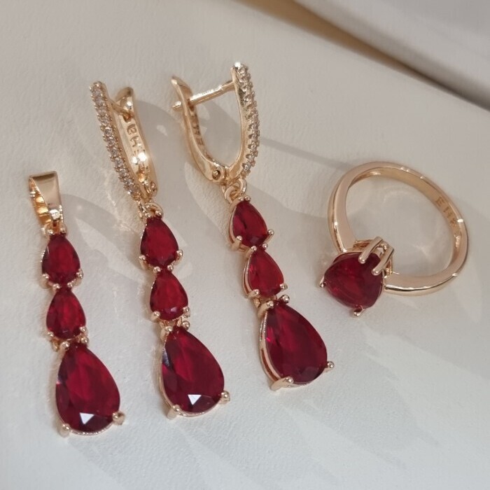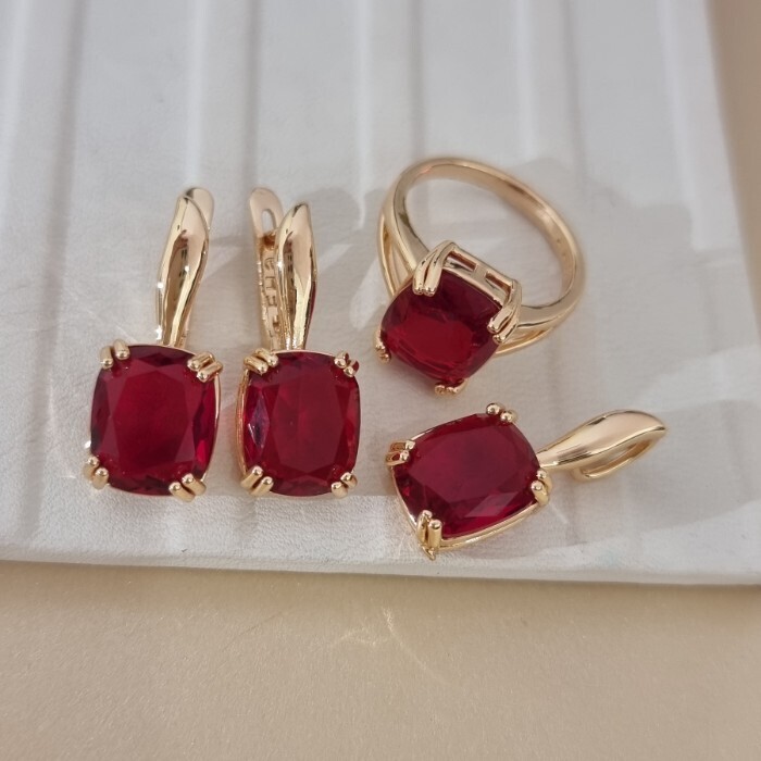 Комплект ювелирной бижутерии коллекция "Дубай" серьги, кулон и кольцо 18 р, покрытие позолота, вставка: стекло, цвет: рубиновый, арт.414.316-18 2 фото