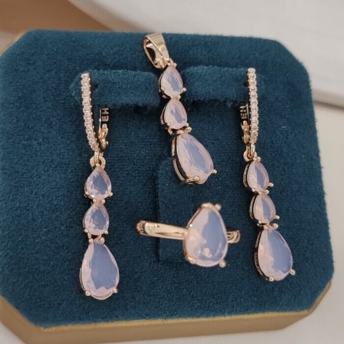 Комплект ювелирной бижутерии коллекция "Дубай" серьги, кулон и кольцо 18 р, покрытие позолота, вставка: фианиты и цирконы, цвет: розовый и прозрачный, арт.414.288-18 2 фото
