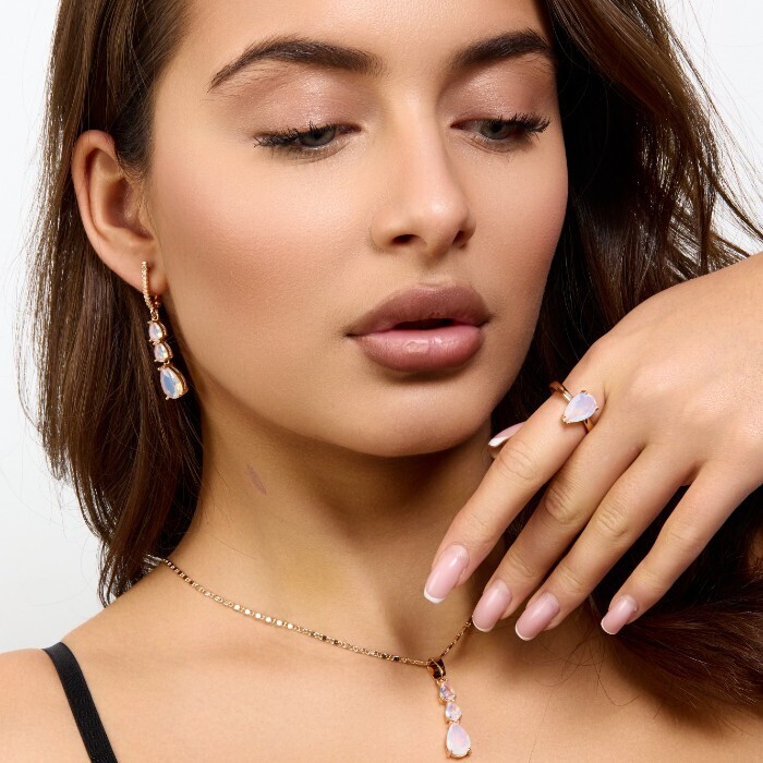 Комплект ювелирной бижутерии коллекция "Дубай" серьги, кулон и кольцо 17 р, покрытие позолота, вставка: фианиты и цирконы, цвет: розовый и прозрачный, арт.414.288-17 2 фото