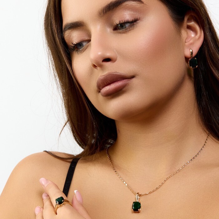 Комплект ювелирной бижутерии коллекция "Дубай" серьги, кулон и кольцо 18 р, покрытие позолота, вставка: стекло, цвет: изумрудный, арт.414.319-18 2 фото