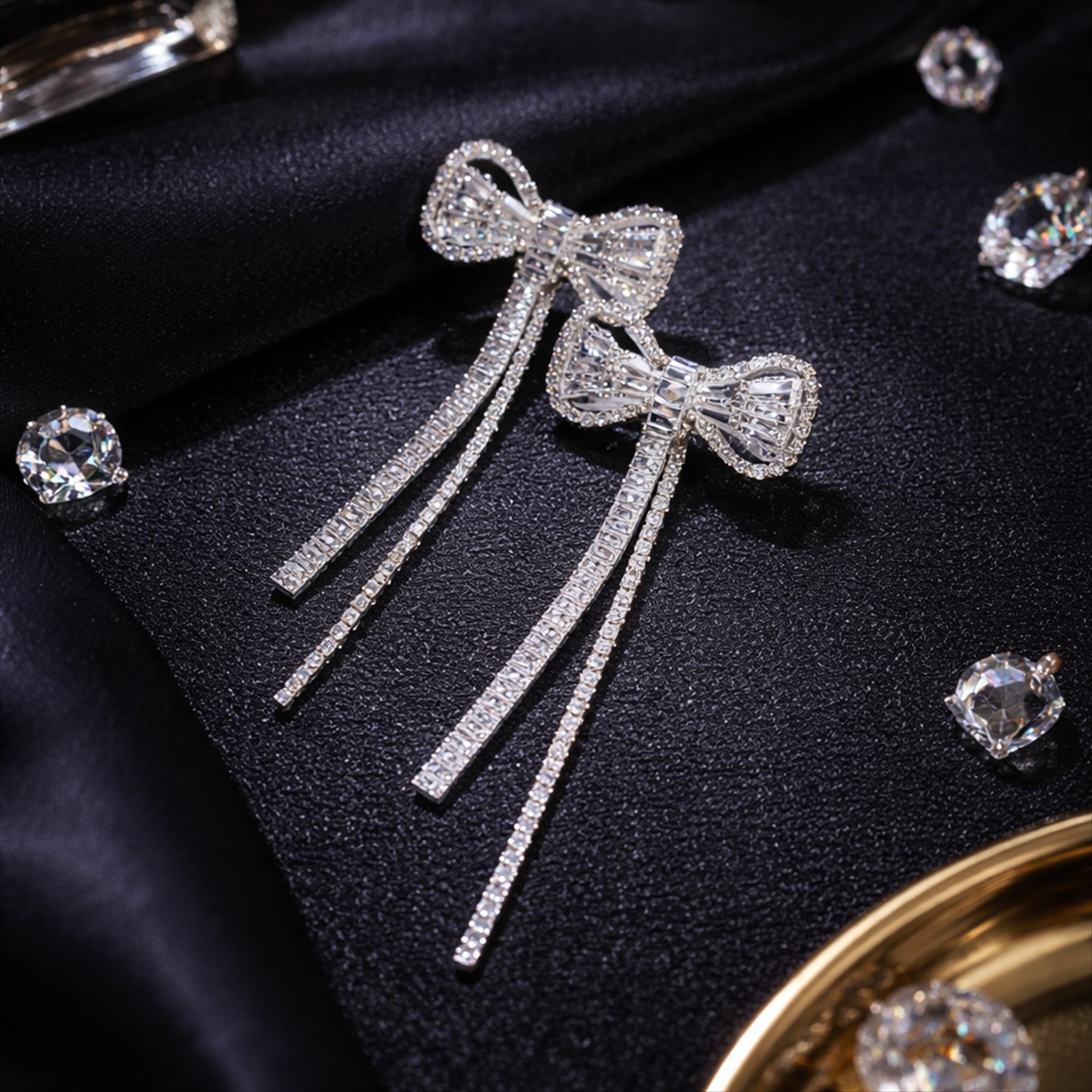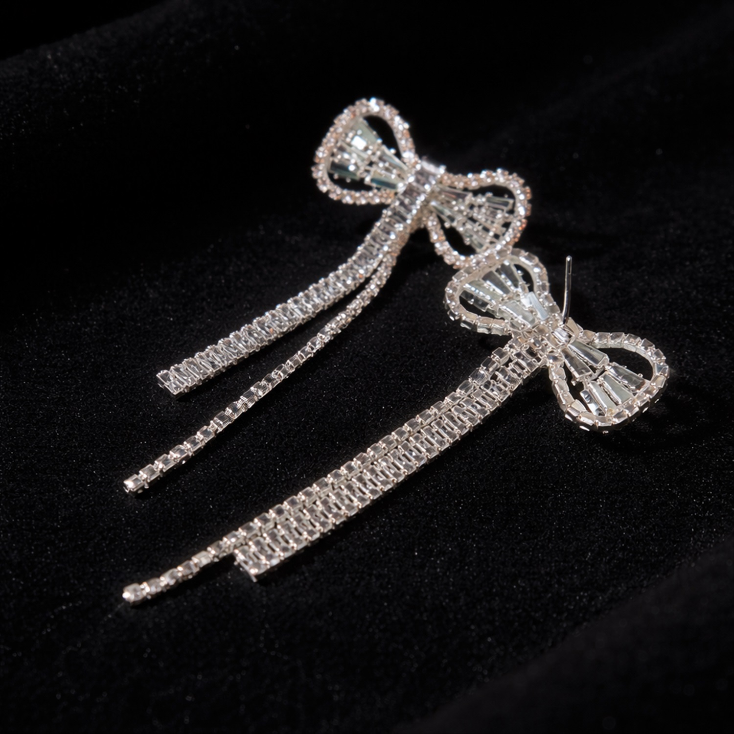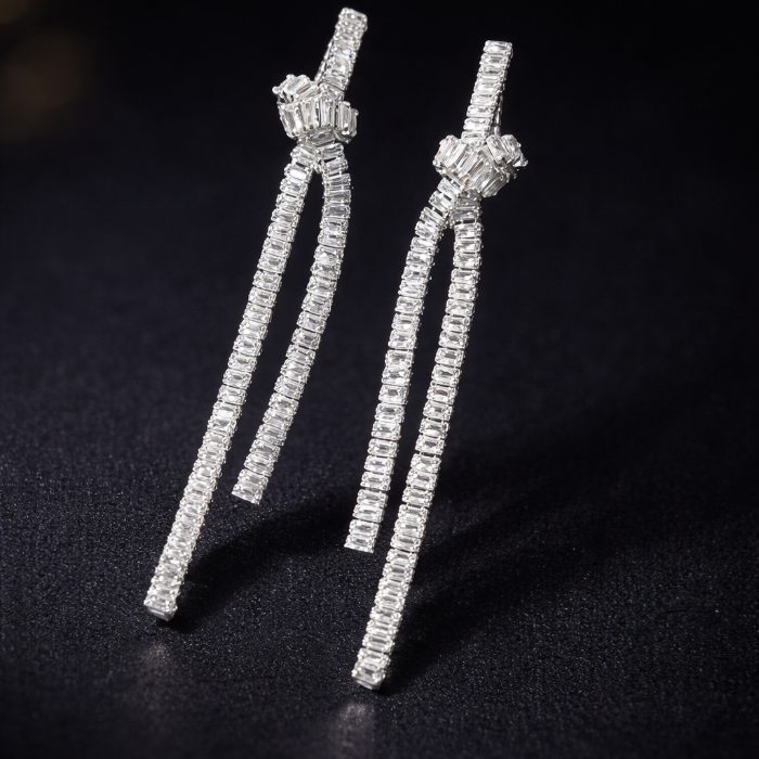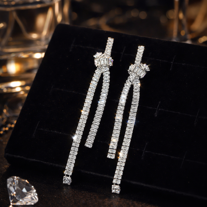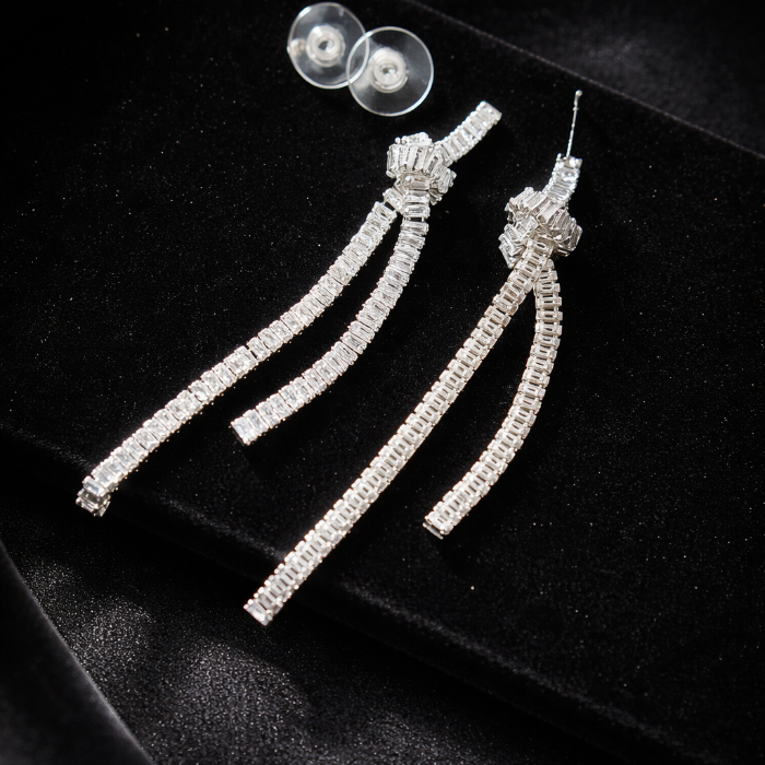 Серьги бантики бижутерия висячие вечерние с камнями, цвет: серебристый и прозрачный, арт.012.074 2 фото