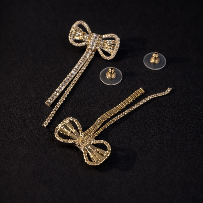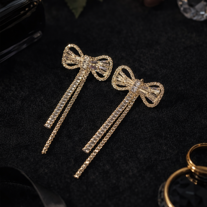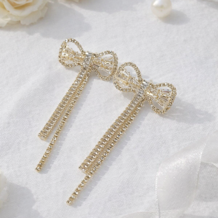 Серьги бантики бижутерия висячие вечерние с камнями, цвет: золотистый и прозрачный, арт.012.072 3 фото