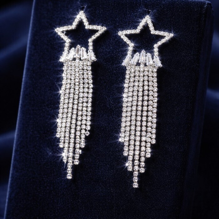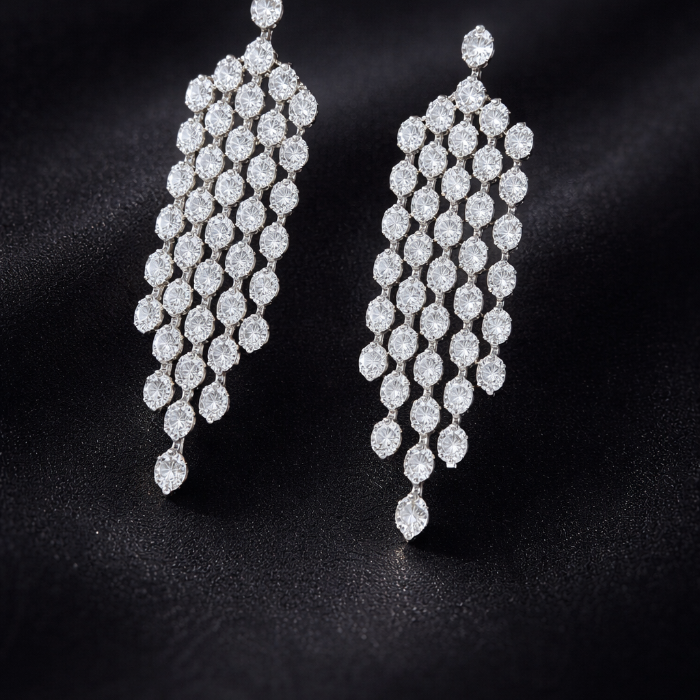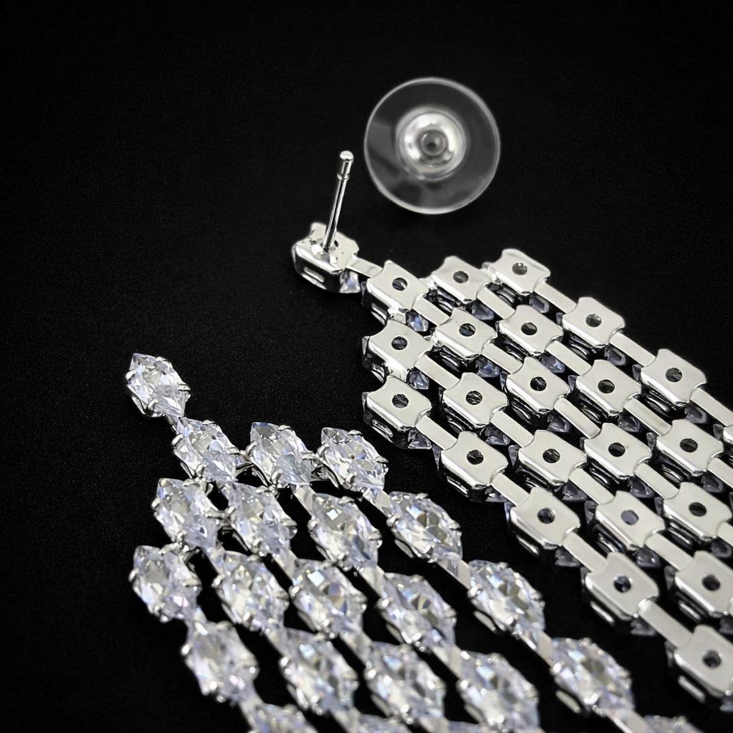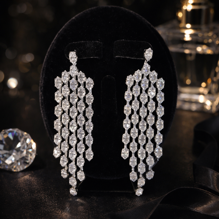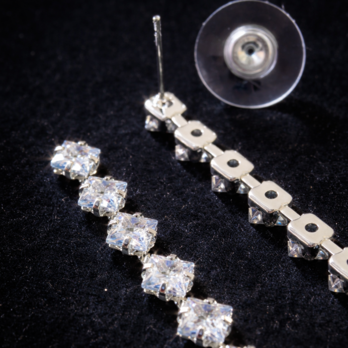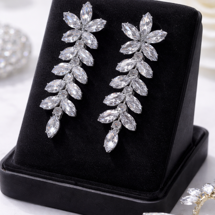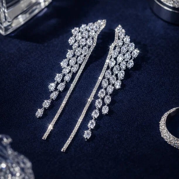 Серьги бижутерия висячие вечерние с камнями, цвет: серебристый и прозрачный, арт.012.054 3 фото