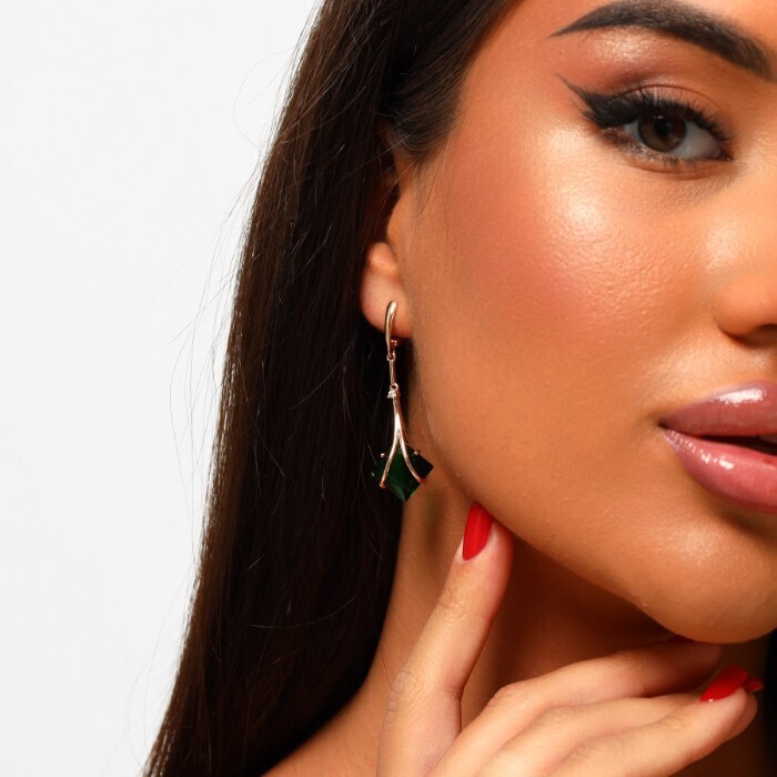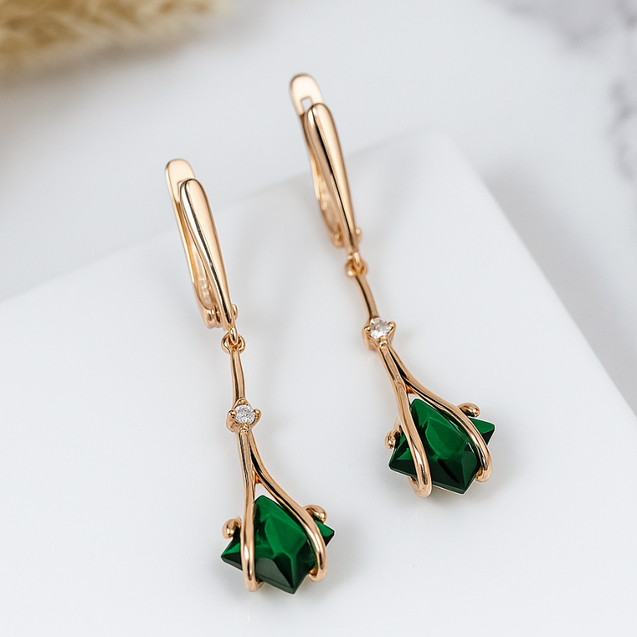 Серьги подвески длинные с зеленым камнем, покрытие позолота 585 пробы, арт.314.981 3 фото