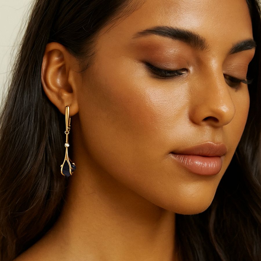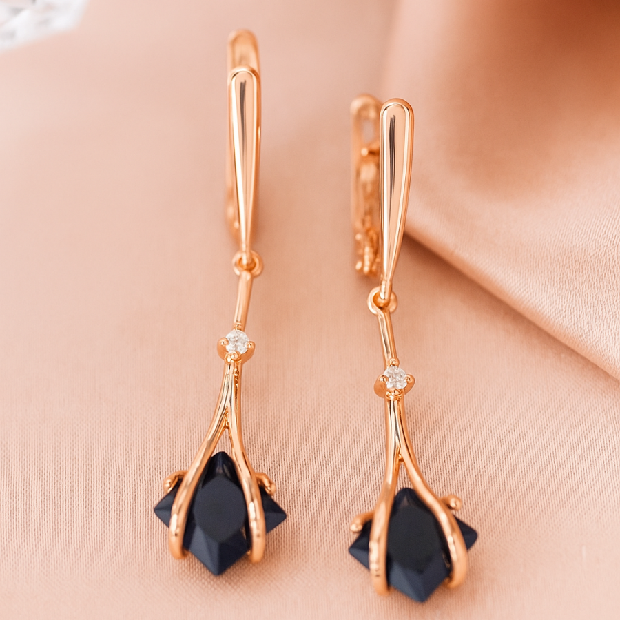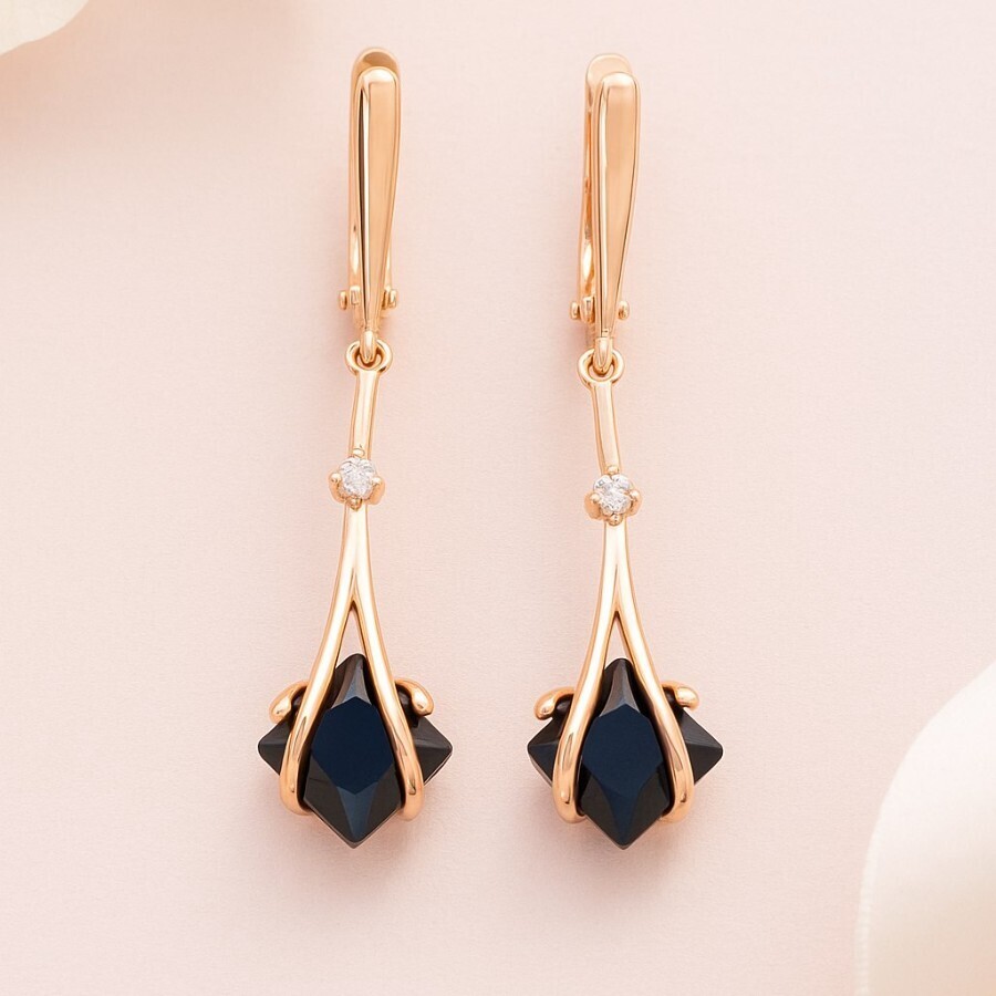 Серьги подвески длинные с черным камнем, покрытие позолота 585 пробы, арт.414.053 3 фото