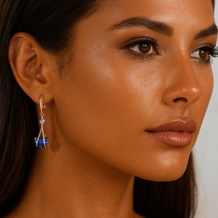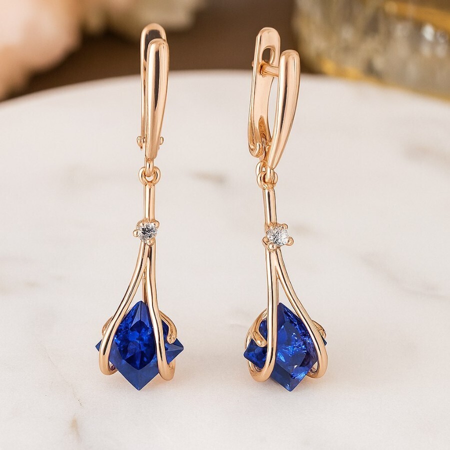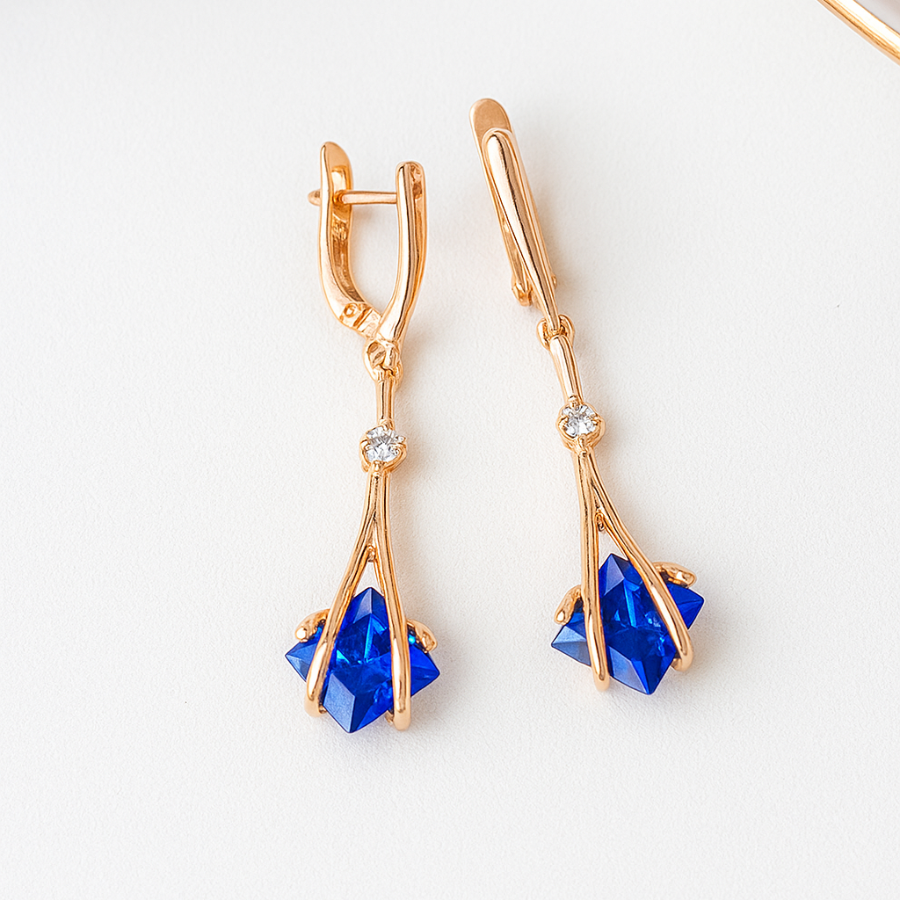 Серьги подвески длинные с синим камнем, покрытие позолота 585 пробы, арт.314.983 3 фото