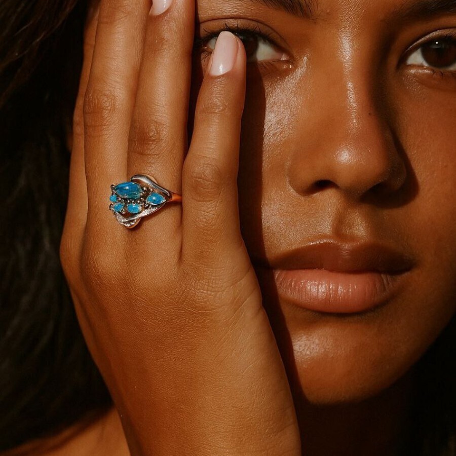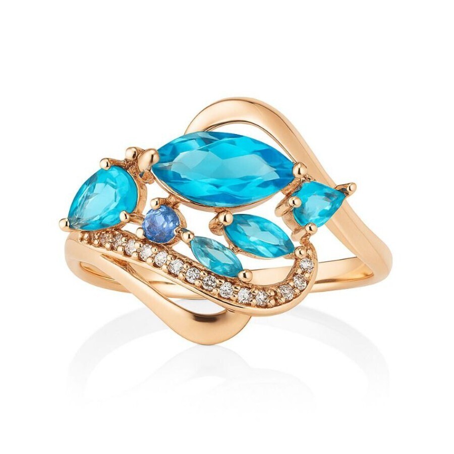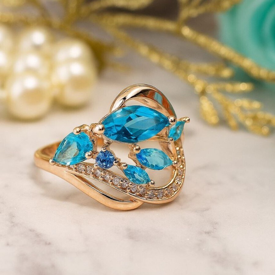 Кольцо 19 р, ювелирная бижутерия коллекция "Дубай", покрытие позолота, вставка: фианиты, цвет: голубой, арт.314.955-19 4 фото