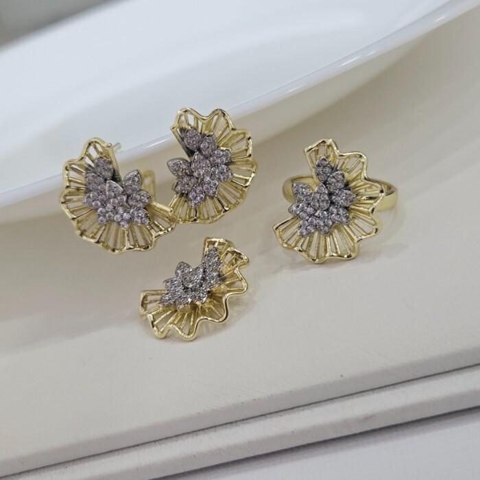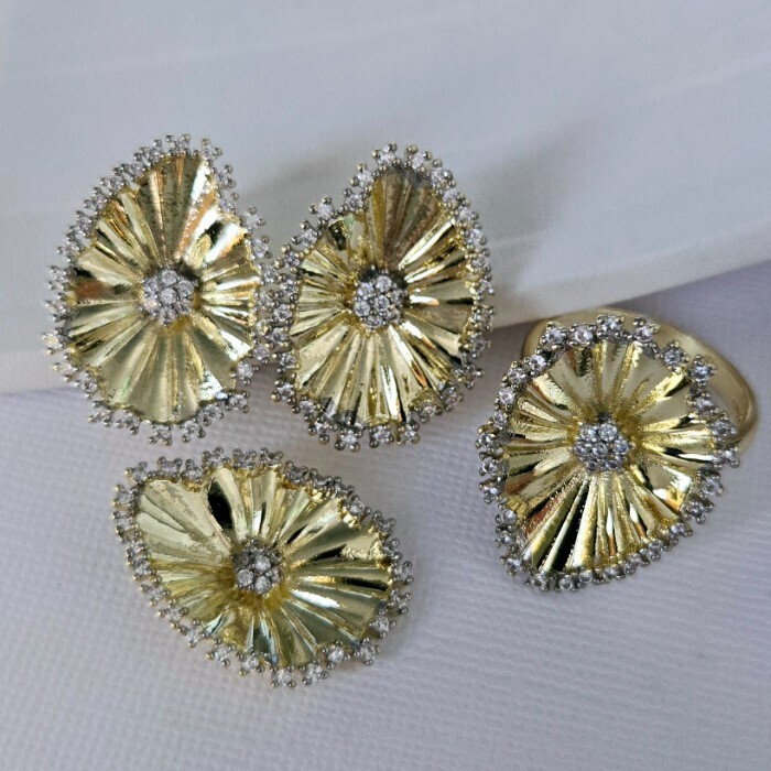 Крупный комплект ювелирной бижутерии коллекция "Дубай" в форме цветов серьги и кольцо 20 р, покрытие позолота, вставка: фианиты, цвет: прозрачный, арт.216.391-20 2 фото