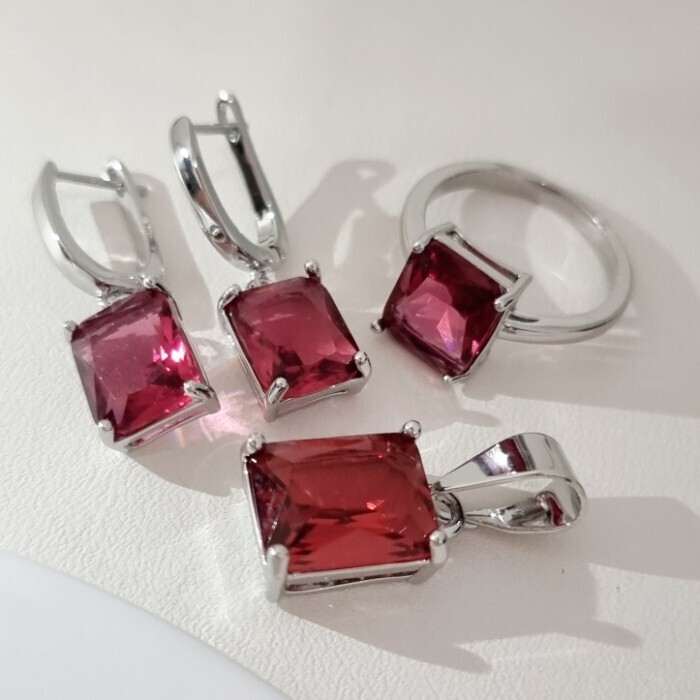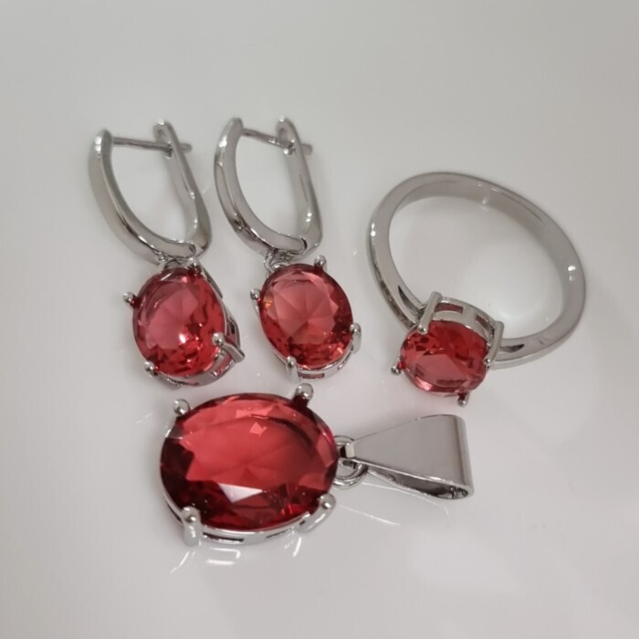 Комплект ювелирной бижутерии коллекция "Дубай" серьги, кулон и кольцо 17 р покрытие посеребрение, вставка: стекло, цвет: рубиновый, арт.215.594-17 2 фото
