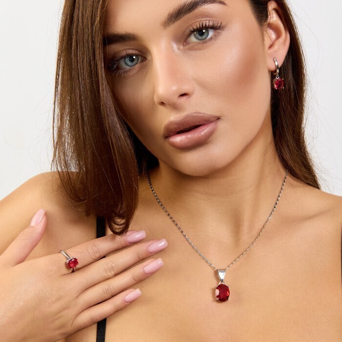 Комплект ювелирной бижутерии коллекция "Дубай" серьги, кулон и кольцо 19 р покрытие посеребрение, вставка: стекло, цвет: рубиновый, арт.215.630-19 2 фото