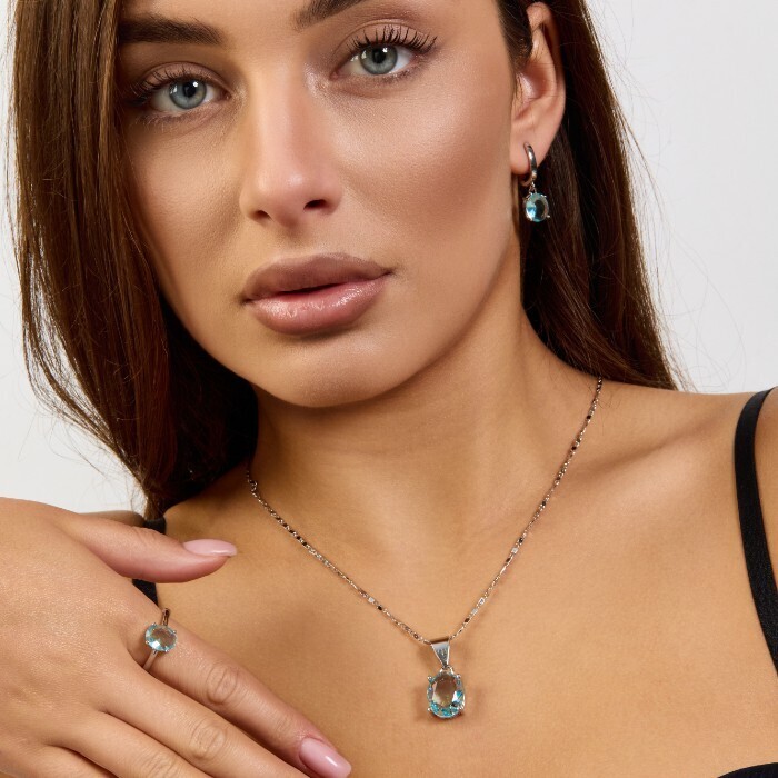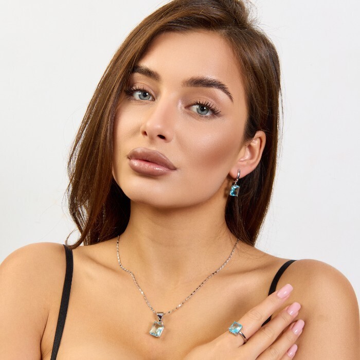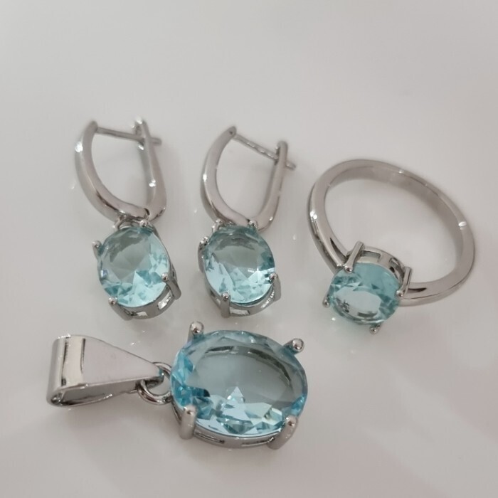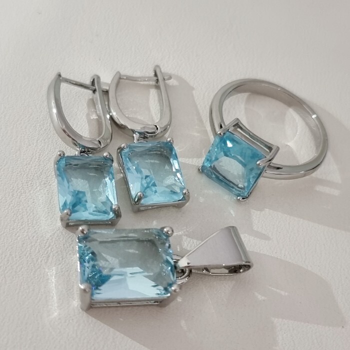 Комплект ювелирной бижутерии коллекция "Дубай" серьги, кулон и кольцо 20 р покрытие посеребрение, вставка: стекло, цвет: голубой, арт.215.595-20 2 фото