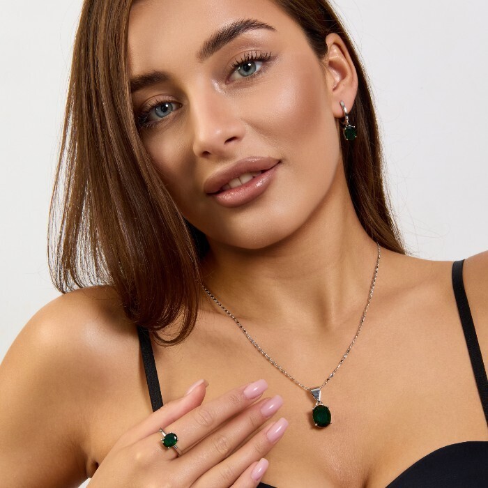 Комплект ювелирной бижутерии коллекция "Дубай" серьги, кулон и кольцо 19 р покрытие посеребрение, вставка: стекло, цвет: зеленый, арт.215.622-19 2 фото