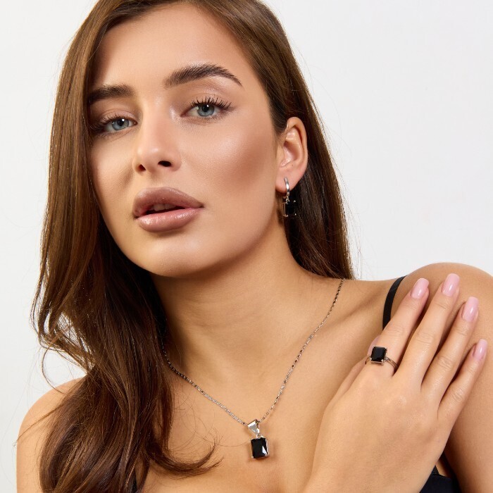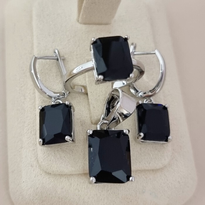 Комплект ювелирной бижутерии коллекция "Дубай" серьги, кулон и кольцо 19 р покрытие посеребрение, вставка: стекло, цвет: черный, арт.215.632-19 2 фото