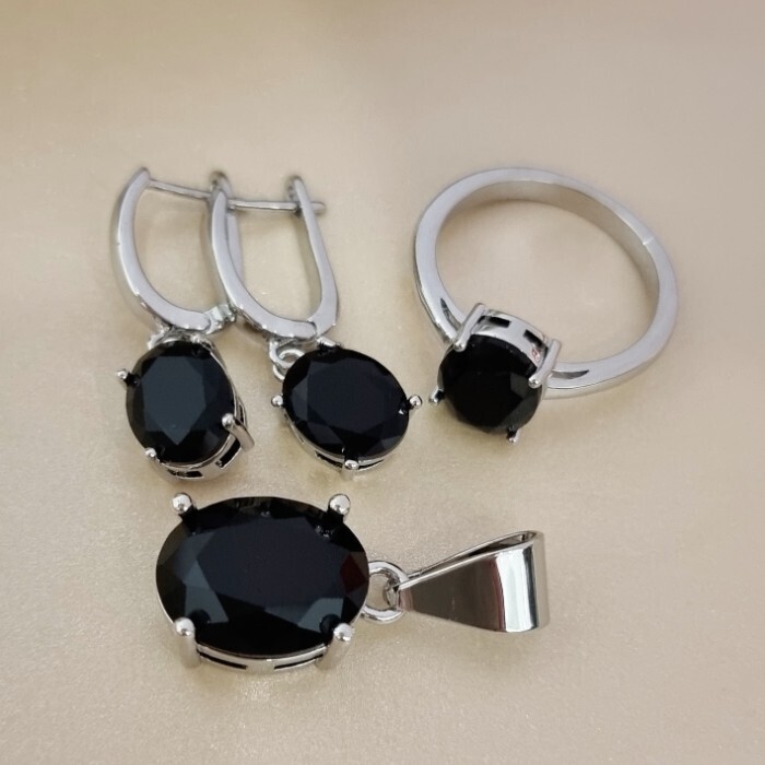 Комплект ювелирной бижутерии коллекция "Дубай" серьги, кулон и кольцо 18 р покрытие посеребрение, вставка: стекло, цвет: черный, арт.215.591-18 2 фото