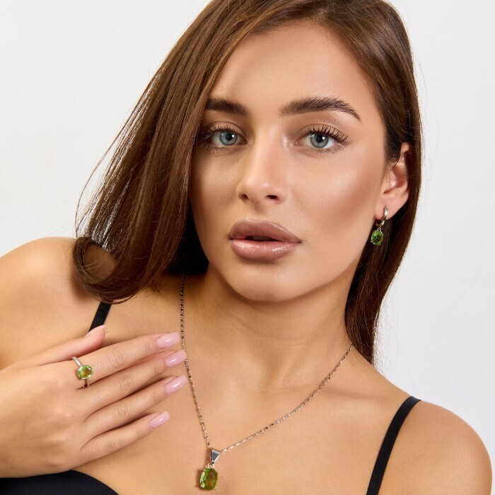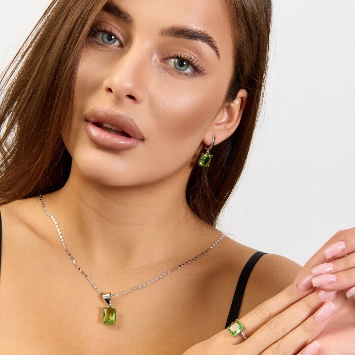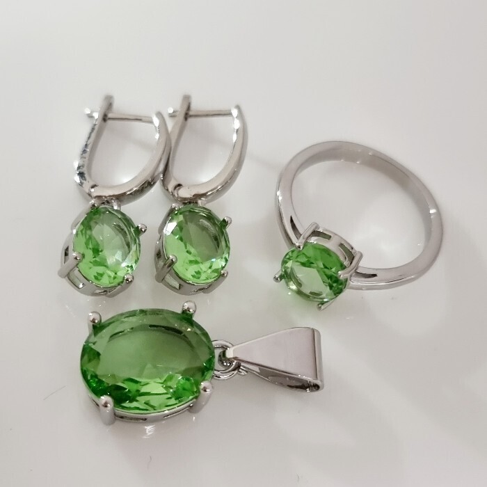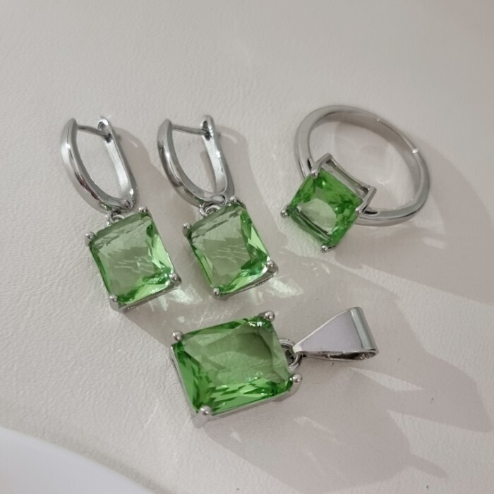 Комплект ювелирной бижутерии коллекция "Дубай" серьги, кулон и кольцо 19 р покрытие посеребрение, вставка: стекло, цвет: светло-зеленый, арт.215.592-19 2 фото
