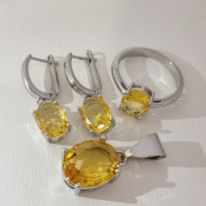 Комплект ювелирной бижутерии коллекция "Дубай" серьги, кулон и кольцо 20 р покрытие посеребрение, вставка: стекло, цвет: желтый, арт.215.593-20 2 фото