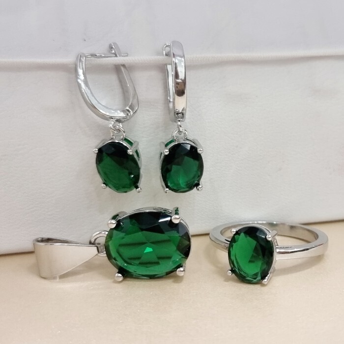 Комплект ювелирной бижутерии коллекция "Дубай" серьги, кулон и кольцо 20 р покрытие посеребрение, вставка: стекло, цвет: зеленый, арт.215.588-20 2 фото