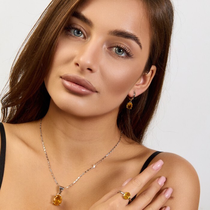 Комплект ювелирной бижутерии коллекция "Дубай" серьги, кулон и кольцо 19 р покрытие посеребрение, вставка: стекло, цвет: желтый, арт.215.593-19 2 фото
