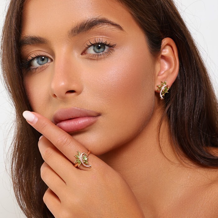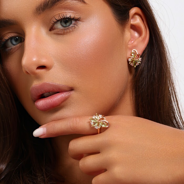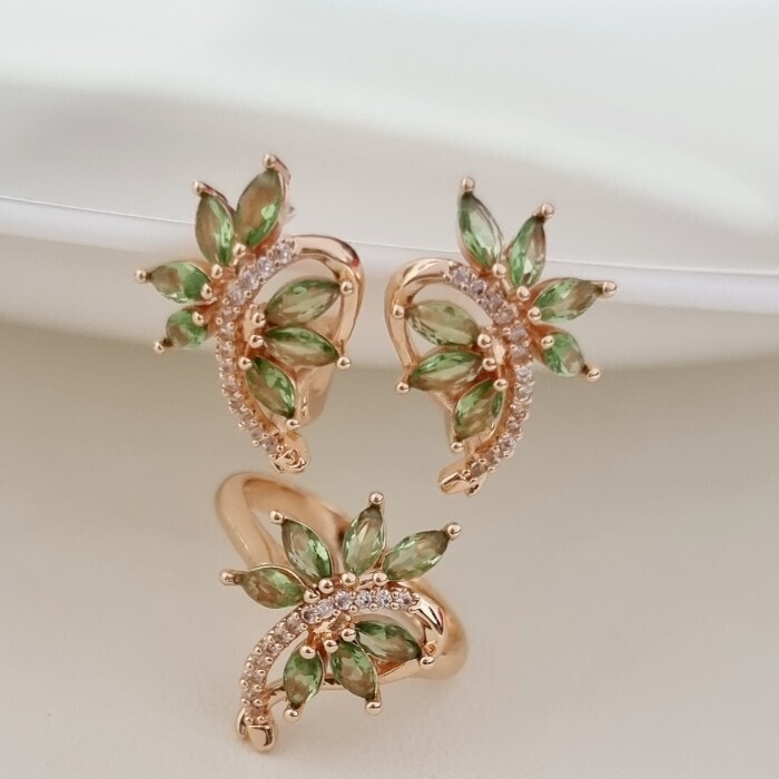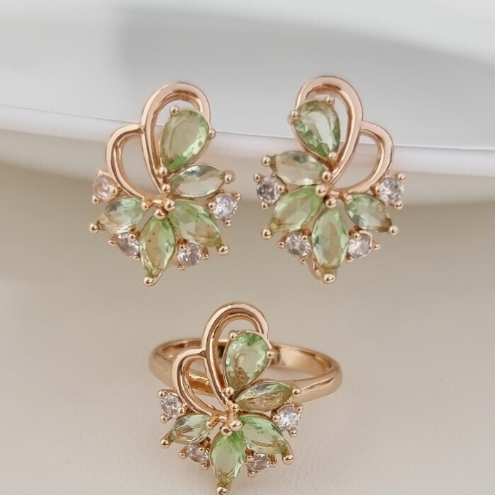 Комплект ювелирной бижутерии коллекция "Дубай" серьги и кольцо 17 р, покрытие позолота, вставка: фианиты, цвет: светло-зеленый и прозрачный, арт.215.482-17 2 фото