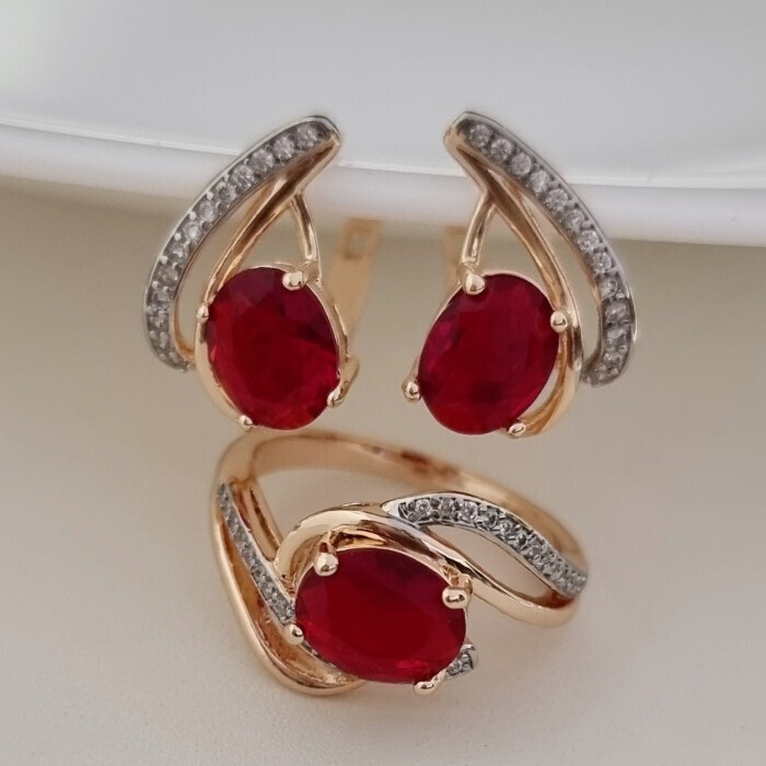 Комплект ювелирной бижутерии коллекция "Дубай" серьги и кольцо 208 р, покрытие позолота, вставка: фианиты, цвет: красный и прозрачный, арт.215.474-20 2 фото
