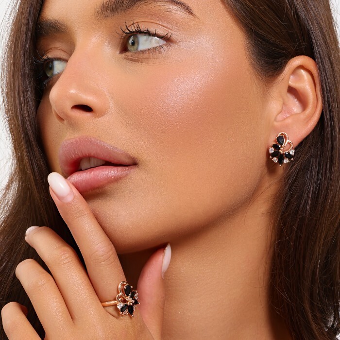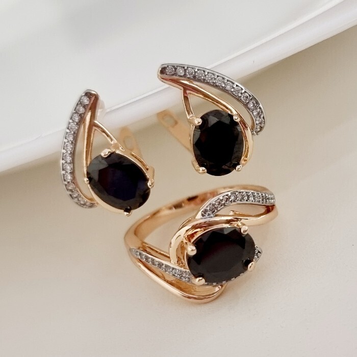 Комплект ювелирной бижутерии коллекция "Дубай" серьги и кольцо 17 р, покрытие позолота, вставка: фианиты, цвет: черный и прозрачный, арт.215.472-17 2 фото